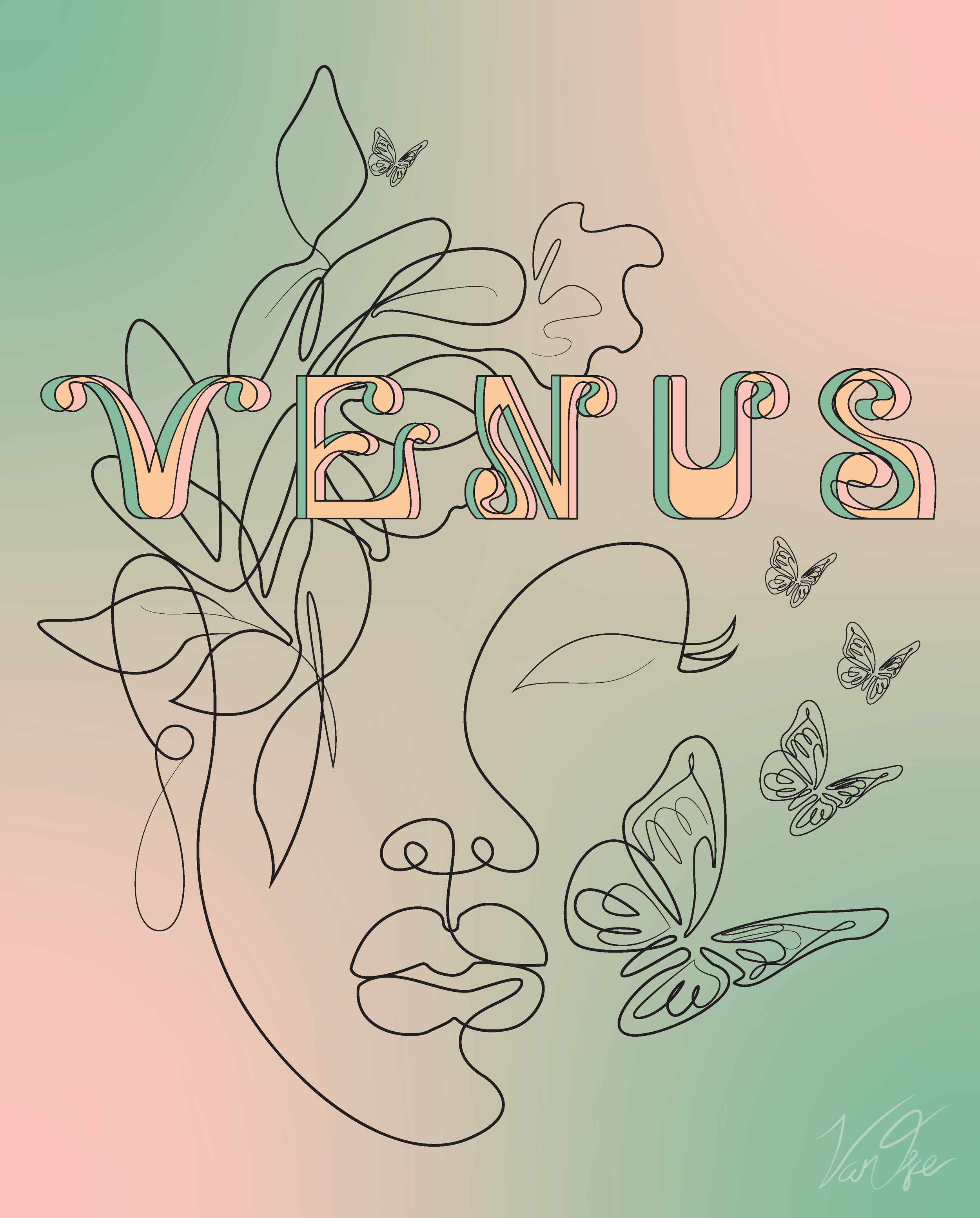 Another strong favorite of mine. I’m very proud of this poster design because I designed the typeface myself! Those letters cannot be found in that style in adobe fonts or on DaFont.com…yet. Hopefully someday it will be a real font! Of course I’m back at it again with the continuous line drawings. My idea of this was to draw the goddess Venus as a Black woman, and I specifically wanted text going across the poster (I just didn’t know I would be making the text myself at the time). It’s a simple yet beautiful poster.